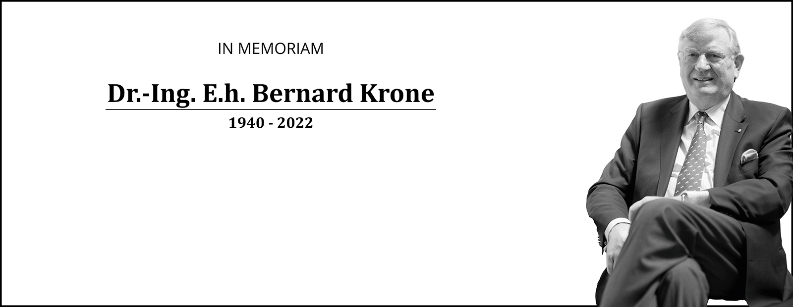 | |  |  | |  |  | |  |  |  |  | | Long-time owner of Krone Group, Dr. Bernard Krone, has passed away | |  | | | It is with deep sadness that we inform you of the passing of long-time owner of the Krone Group, Dr.-Ing. E.h. Bernard Krone, after a short serious illness in Spelle, Emsland, on October 14th, 2022 at the age of 82. The family, the entire company management and all employees will continue his life's work with commitment for generations to come. Read more.. | |   | |  | | Ondernemende persoonlijkheid, Dr. Bernard Krone overleden |  | Met grote verslagenheid hebben wij kennisgenomen van het overlijden van langjarige eigenaar van de Krone Groep, Dr. Ing. E.h. Bernard Krone. Op 14 oktober 2022 is Dr. Bernard Krone op 82-jarige leeftijd overleden na een korte ernstige ziekte in Spelle, Emsland. Lees meer.. |   | |  | |  |  | |  |  |  |  | Bezoekadres Theo van Doesburgstraat 8 5753 DL Deurne, Nederland Privacyverklaring | Postadres Postbus 343 5750 AH Deurne, Nederland Afmelden | |  | |  | |